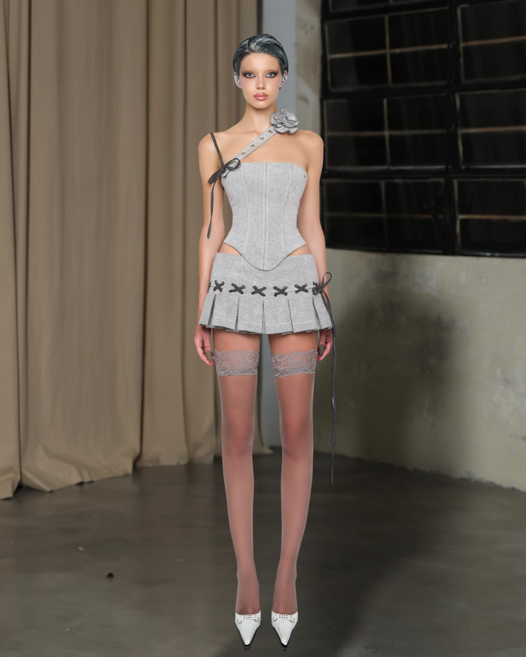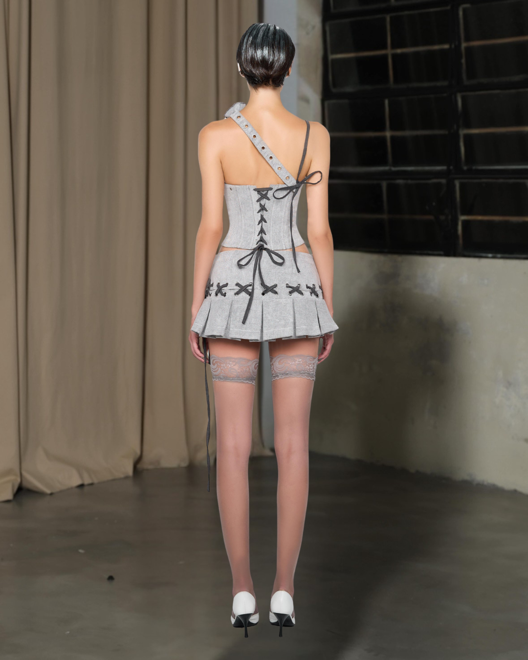 The Lace-Up Corset & Pleated Mini Skirt Set, a bold yet sophisticated ensemble designed to make a statement. The waist-cinching corset, an asymmetrical strap, and a sculpted fit, creating a striking silhouette with a modern edge.