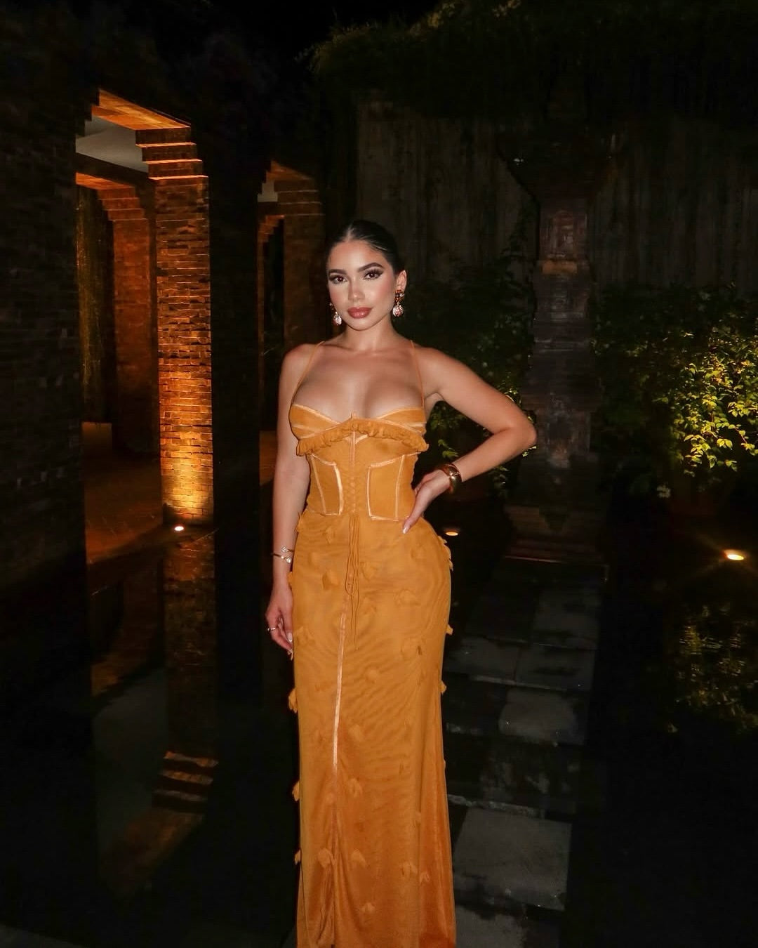 As seen on Leah Halton, this corsetry maxi dress is a romantic showpiece made for sunset soirées and elegant evenings away. Featuring a structured bodice with bonded lace-up detailing at the waist, it beautifully cinches the silhouette while offering an adjustable fit with delicate shoulder straps. The bust is finished with soft ruffle accents, adding a feminine touch to the sculpted form. Cascading to the floor in sheer, flowing layers, the skirt is adorned with handsewn floral appliqués that move with you—creating a dreamy, textured effect from front to back. Whether you're styling it for a beach wedding, garden party, or a coastal dinner, this dress is the definition of modern-day romance.