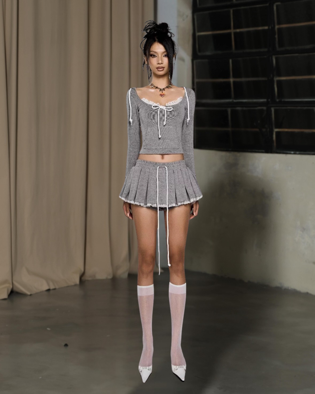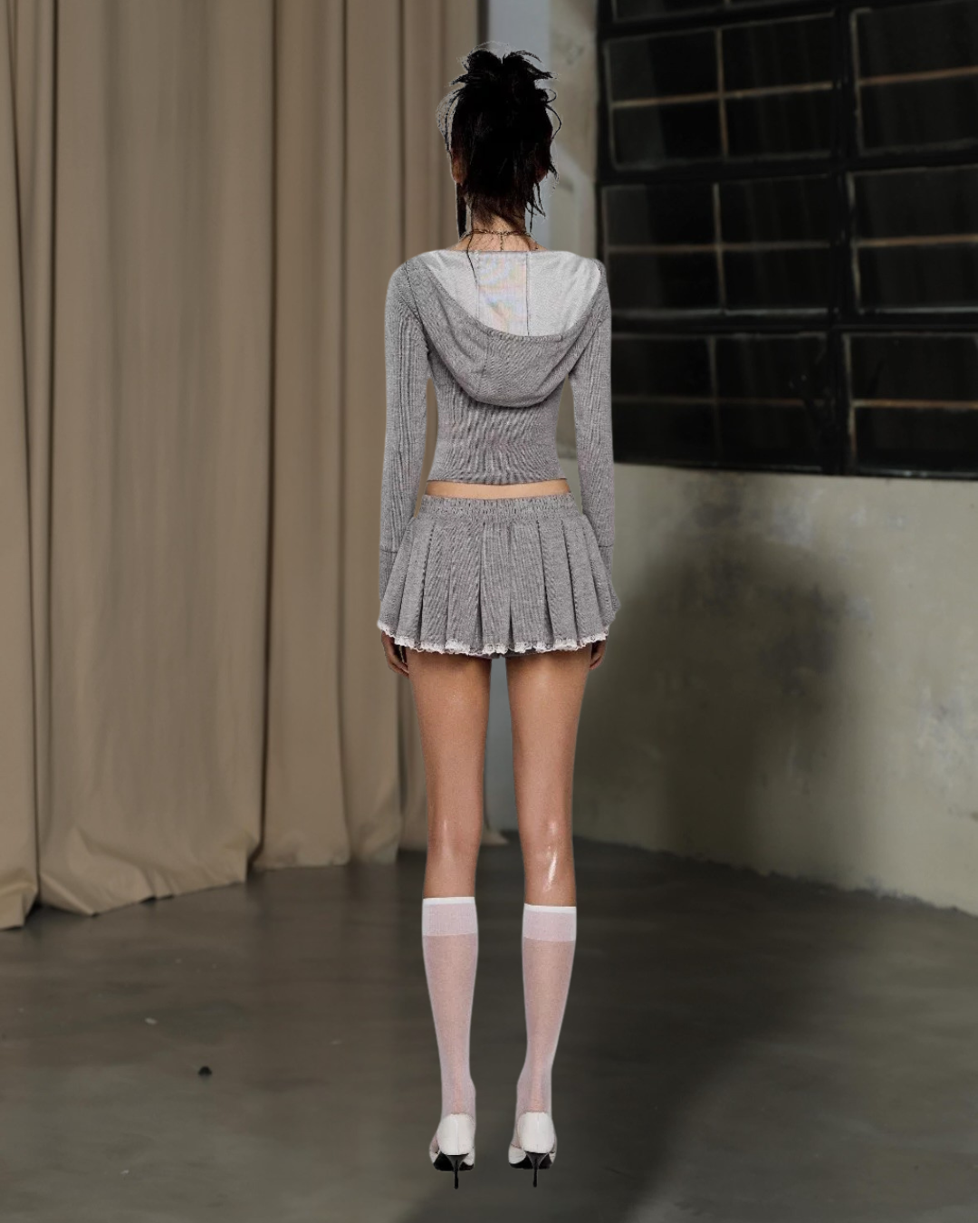 The Lace-Trim Pleated Skirt & Cropped Hoodie Set, a perfect blend of femininity and sporty edge. The pleated mini skirt features delicate lace trim and built-in shorts for added comfort and coverage, giving a playful yet practical touch.