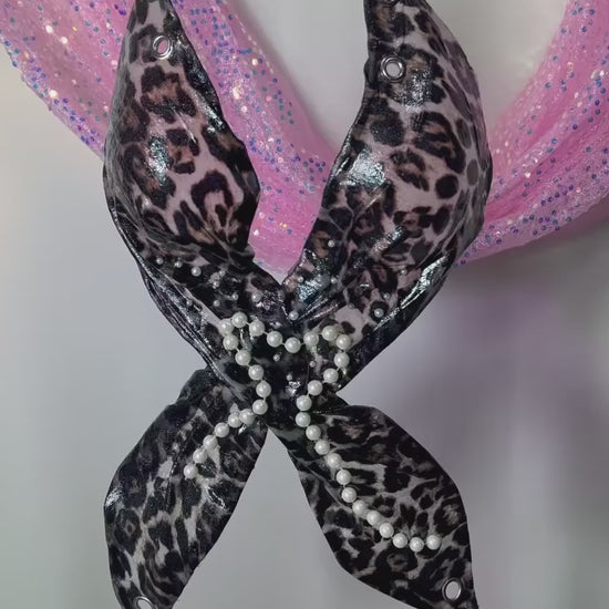 The entire top is constructed using leopard-patterned fabric as the base structure. The top is finished with a double gloss coating, creating a sleek, high-shine surface while maintaining a body-contouring fit.