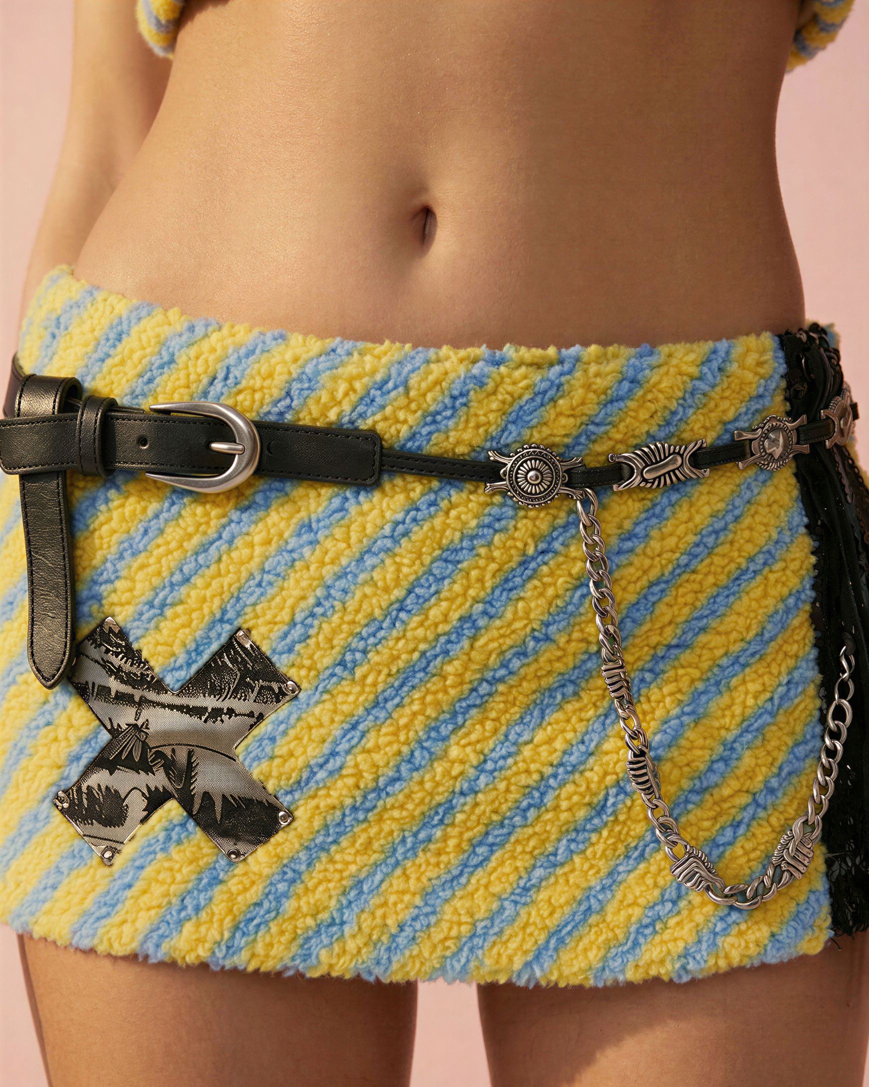 - Low-waist mini skirt with buckle strap and embroidered patch accents