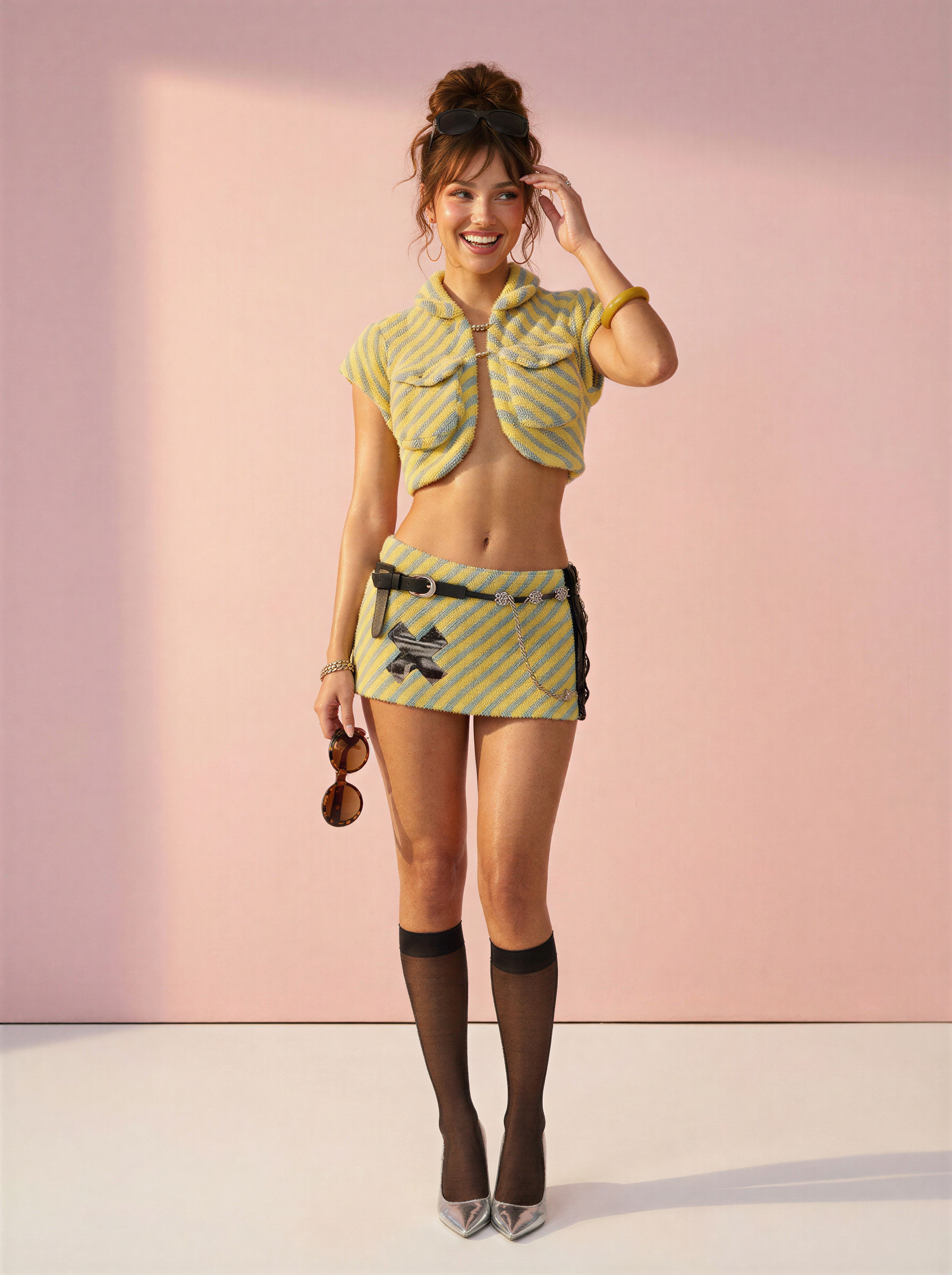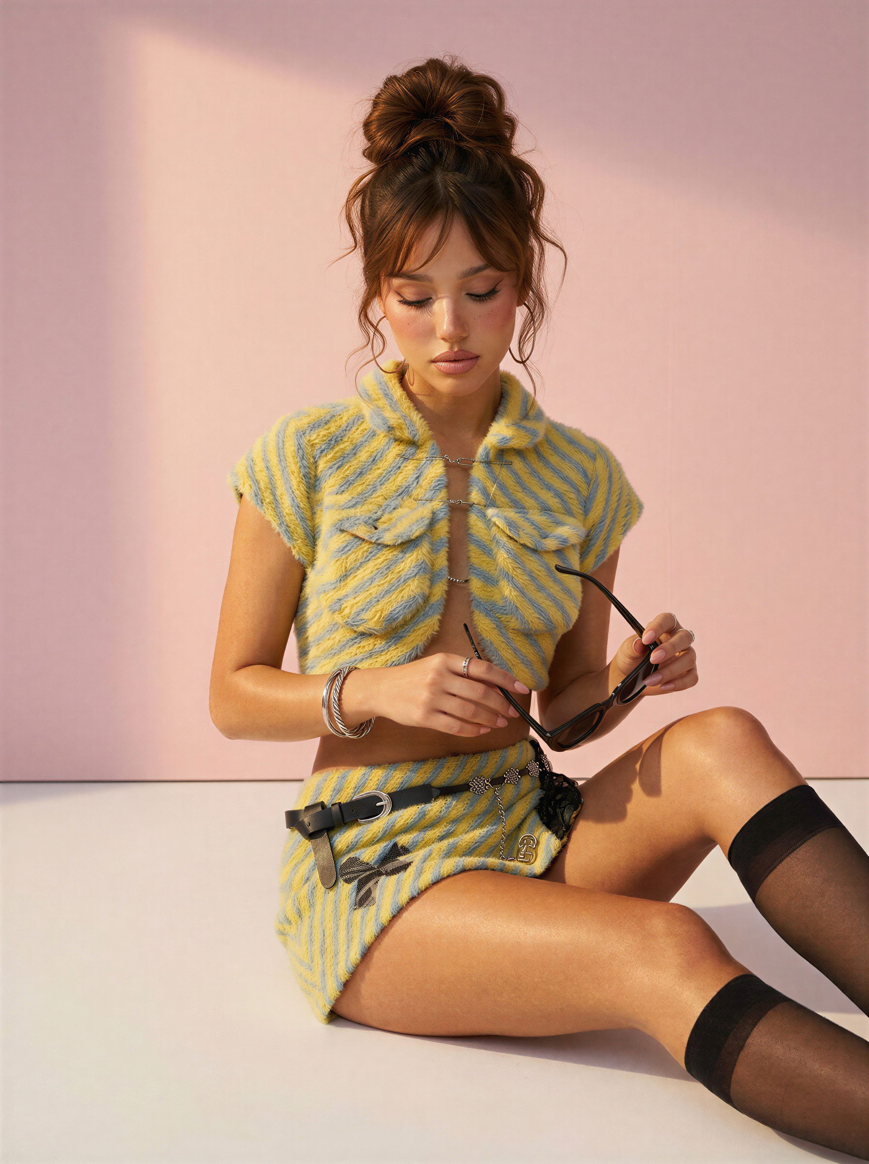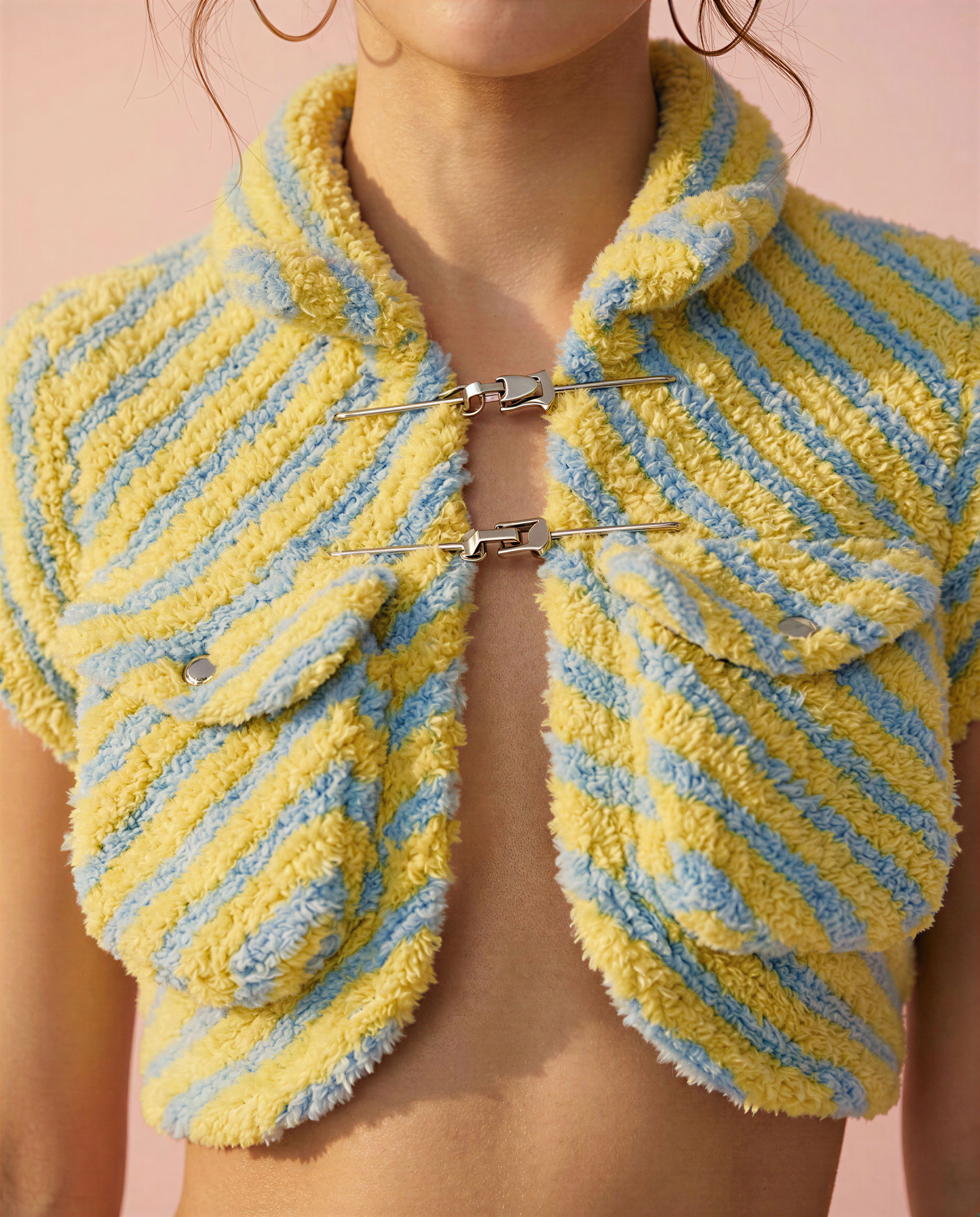 The Popcorn Set is a bold, textured two-piece that brings playful energy to your after-dark wardrobe. Crafted from soft popcorn bouclé knit in a striking yellow and blue diagonal stripe, this set features a cropped collared top with short sleeves and metallic clasp closures, paired with a low-waist mini skirt with edgy buckle and patch detailing.