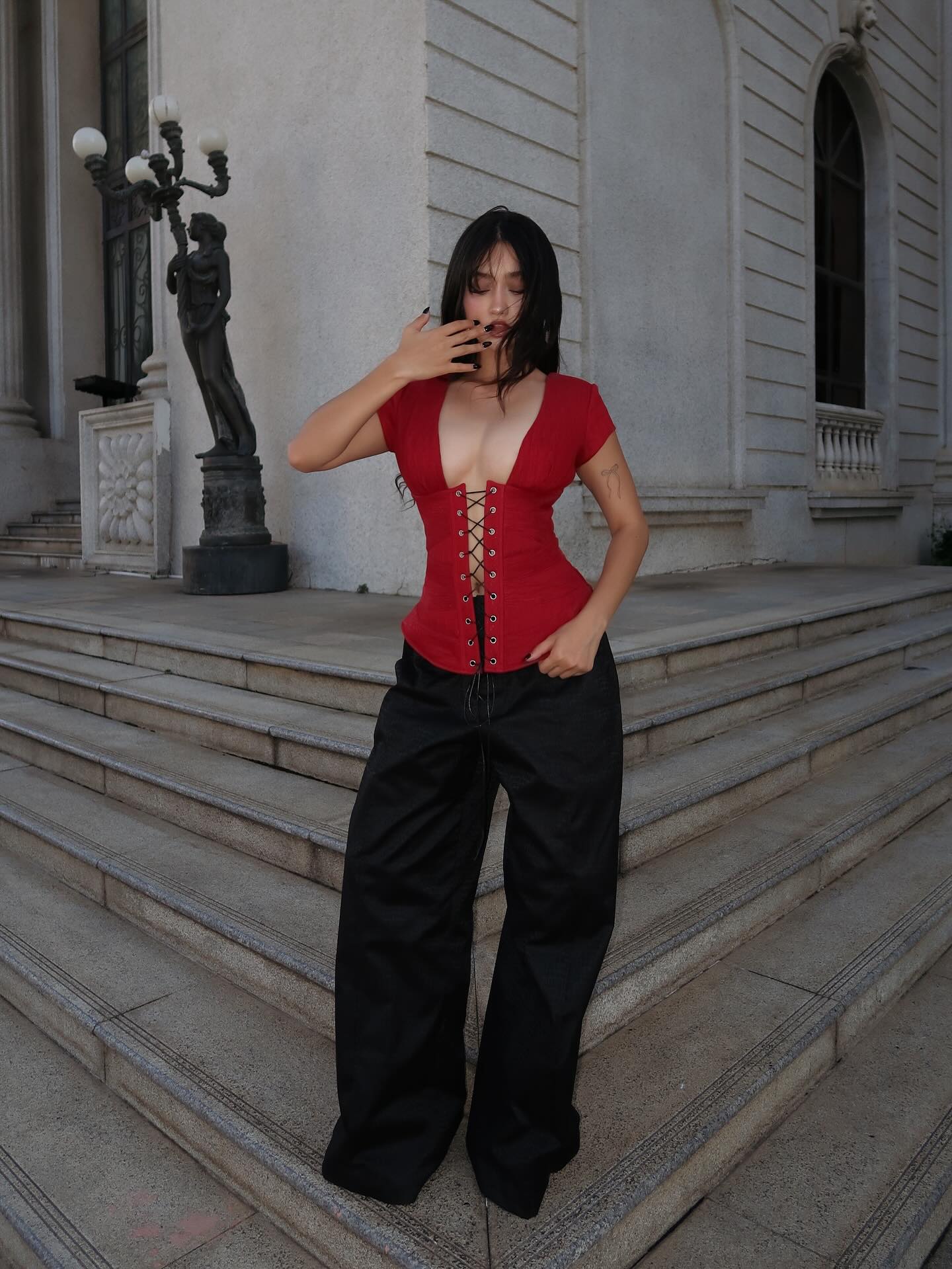The Rose Corset Top is a bold blend of structure and sensuality. Crafted from textured stretch fabric in a striking deep red, it features a sculpted silhouette with a plunging neckline and lace-up front that cinches perfectly to the waist. The structured paneling enhances your curves while maintaining comfort and flexibility. With capped sleeves and a cropped cut, this piece channels effortless confidence — perfect for pairing with tailored trousers or a sleek skirt for an edgy yet feminine look.